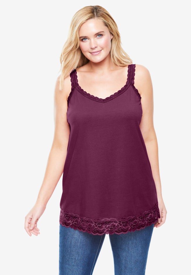 A knit sleeveless top softened with pretty lace along the V-neck and straight hem. This will be your easy go-to for warm days, layering and more. Made in a comfortable, relaxed fit.
