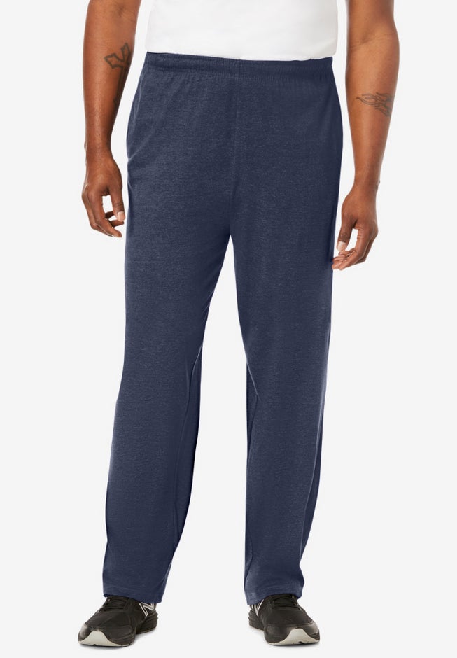 These lightweight big and tall open-bottom sweatpants are made for everyday comfort with a relaxed fit that moves with you. The breathable jersey fabric feels soft without weighing you down, while the adjustable waistband gives you a personalized fit. Perfect for lounging, quick errands, or casual days, they pair easily with your favorite big and tall tees or hoodies.