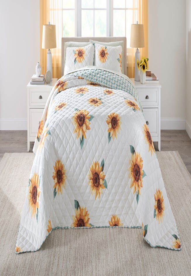 Bring the joy of sunny days into your master bedroom or guest room with the Sunflower 3-Pc. Bedspread Set. The bold sunflower print instantly brightens your space, while the reversible mini-sunflower pattern offers versatility for every season. Cozy quilting adds warmth and comfort, creating a cheerful bedding layer that feels right at home in any family household.